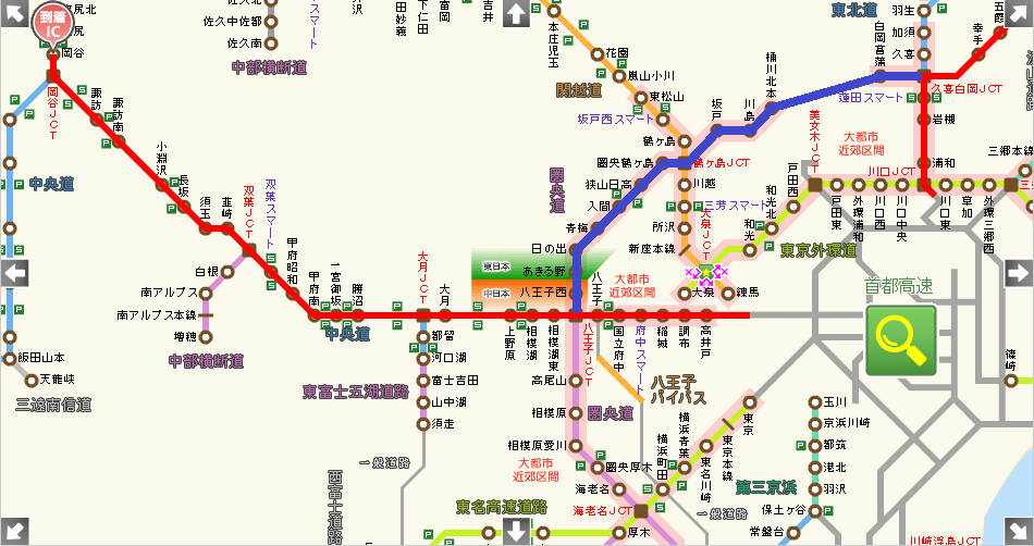 つまり、下の地図を見てほしいのですが(クリックで大きくなります)、境古河ICから岡谷ICへ行く際に、圏央道開通前は首都高を通らないと中央道に抜けられない(赤線のルート)ところ、圏央道開通後は青線でマーキングしたルートでショートカットできるので、首都高を通る必要が無くなるってわけです。